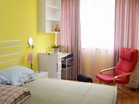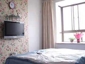 無疑,臥室中最主要的家具應(yīng)該是床,但衣柜的地位也很重要。我選擇了一組實(shí)櫸木的衣柜,有三個大抽屜,里面可以放衣服和其它日用品,抽屜上面的開放空間可以方便的放置許多物品,電視置于其中,充分地利用了空間。磨砂玻璃柜門,其質(zhì)感使室內(nèi)顯得明亮開闊。