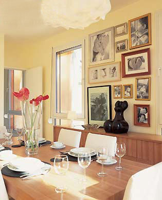 每一張照片都有一個(gè)故事。周末的時(shí)候,一家人圍坐在餐桌旁,邊吃飯邊話說(shuō)當(dāng)年,合著窗外暖暖的陽(yáng)光,其樂(lè)融融。幾乎貼滿墻壁的照片,沒(méi)有什么規(guī)則地排列著,花瓶、餐具、桌椅等物品雖然很多,看似復(fù)雜,卻在顏色與形式上統(tǒng)一成對(duì)美好歲月的回憶和感謝。