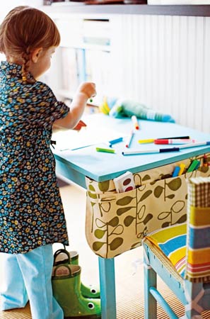 裝園藝工具的帆布袋經(jīng)過(guò)一點(diǎn)微小改動(dòng)后成為孩子們的畫(huà)筆收納袋,尼龍搭扣的設(shè)計(jì)讓袋子伏貼于桌子旁邊,從此寶貝兒的畫(huà)筆就不會(huì)再到處亂滾了。