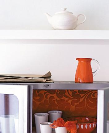 用鮮亮圖案的材質(zhì)或墻紙來重新裝飾櫥柜,這是一個(gè)簡單易行的制造沖擊力的方法。用當(dāng)代風(fēng)格的墻紙、壁布,甚至是印刷品都可以,將它們貼在櫥柜里面、柜門上或者干脆就貼在外面。但最好和整個(gè)空間的風(fēng)格和色調(diào)相協(xié)調(diào)。