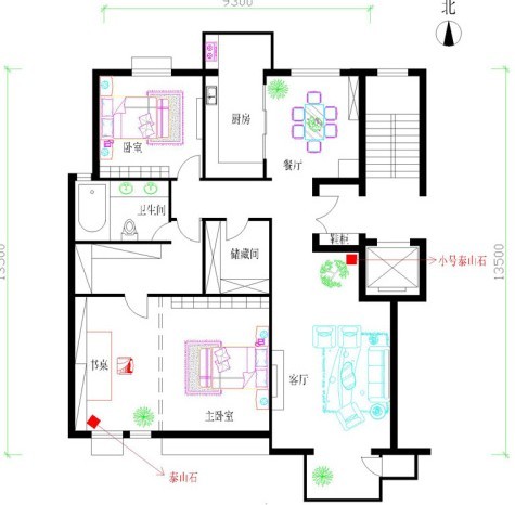 臥居正南,四綠文曲星(文昌星)臨臥。臥室內(nèi)含書房,以助文運(yùn)。財(cái)居此宮,木火通明(震門東方木,離臥南方火)。旺象相生,安床時(shí)候頭向東方,正和本位??芍骶诱咄?cái)旺業(yè),如果再加紅色喜氣之色予以點(diǎn)綴,更可起到火燒旺財(cái)之象,何憂居者不富?此地南方缺陷,有損文昌星與財(cái)星之力,故以泰山石予以填補(bǔ)不足。