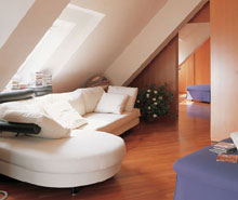 閣樓雖然看似復雜難用,卻有它與生俱來的優(yōu)點。閣樓空間豐富,富有趣味和變化;閣樓平均層高低,因此更使人感覺親切、溫暖,富有安全感;閣樓是神秘的,天然的斜面使室內(nèi)的光影變幻萬千;閣樓是最高的,有最開闊的視野、最新鮮的空氣;閣樓也是最貼近藍天的,躺在出自大師Antonio Citterio之手的白色沙發(fā)上,透過屋面的斜窗,感受一下“日看白云夜看星”的生活吧!也許我們還可以想得更遠一些,想到童話中閣樓里的精靈,想到閣樓里的公主終于見到了白馬王子,想到巴黎圣母院閣樓里的愛情故事……為什么它們總是發(fā)生在閣樓里?因為閣樓意味著溫暖和浪漫。