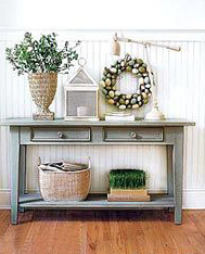 在客廳的玄關(guān)處擺放一張淺綠的原木臺,用鵝卵石拼成的花環(huán)帶來了濃濃的田園氣息,與原木家具的本質(zhì)相當契合,輔以藤制籃子,配上小花小草,清晰的風情立馬鮮活了起來。用原木家具搭配出淳樸的玄關(guān)效果相比濃重甚至奢華的更讓人覺得親近、自然。