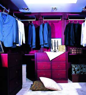 禮服、西褲、襯衫、皮鞋、領帶雖然面貌單一,卻是成功男士不可缺少的,所以妥善安置它們是男性衣帽間的重點。經(jīng)典的桉木、尊貴的黑檀木都是適合男士品位的衣帽間材質(zhì),再配以鋁鈦合金掛桿,顯得內(nèi)斂、穩(wěn)重、大氣。