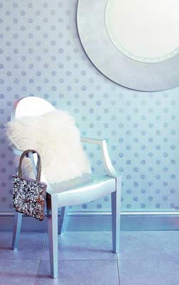 在灰色的墻面上畫上銀色的模板圖案,效果令人稱奇。金屬光澤涂料容易顯現(xiàn)墻面的瑕疵,因此要事先做好表面預(yù)處理,選用100%亞克力涂料是不錯(cuò)的選擇,易于涂裝,干燥快。