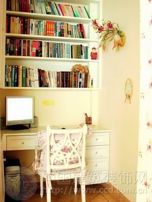 裝修后的立柱成了劃分客廳和書房區(qū)域的分界線,依立柱劃分左右兩個區(qū),左側是定做的長排大衣柜,柱子右側一個多平米的地盤則變成了“書房”。麻雀雖小五臟俱全,電腦桌、書架、吊柜全都有,甚至再擺放一臺掃描儀也沒問題。當然了,家具尺寸都是依照電器尺寸量身定做的,不然哪里能活生生偷出1平米的空間呢?