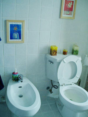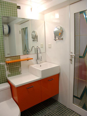 抽水馬桶的沖水槽上方是用廁時達不到的地方,我們可以利用此空間做一吊柜,深度約15厘米,才不致給人造成不便。柜內(nèi)可放置衛(wèi)生紙、手巾、洗潔劑、女性衛(wèi)生用品等,也可在下部做成開放式,放些綠色植物裝飾。