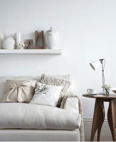 純白色墻漆奠定室內(nèi)主色調(diào),純白沙發(fā)上隨意堆砌數(shù)個白色布藝靠墊,或編織而成、或以雛菊、蝴蝶結(jié)等裝飾,美觀大方。純木小桌給白色世界加上了難得的一筆自然色。臺燈、咖啡杯、水杯、碗、花等一律白色。沙發(fā)背后墻面架子上,瓷花花瓶、木質(zhì)花瓶、折疊花瓶等將空間裝點得越發(fā)生動。