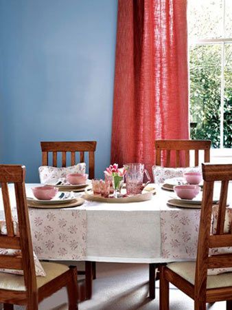 素色的回歸最能代表居家情緒的溫度,那是返璞歸真的淡定和從容。淡藍灰色墻面搭配大幅淺紅色窗簾,然后用覆盆子紅、柔和粉紅色調(diào)的布藝及配飾營造出一種別樣的溫馨與雅致。