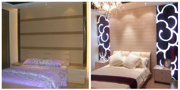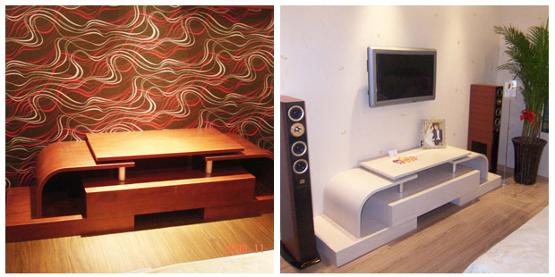 上面兩幅圖一個艷麗,一個淡雅。如果單就裝修而言,左圖頗具心思,一款抽象的線形花紋背景墻與電視柜以及地板很好的呼應(yīng)起來,顏色和諧統(tǒng)一,溫暖中透出溫馨;右圖相對簡單,素白墻壁搭配淺色系電視柜,近乎平凡,然而,通過音響、盆栽、液晶電視以及一框相片的點綴,看似簡簡單單,卻勾勒出“簡約”家的味道,簡單裝飾搭配出了精巧的效果。 有道是:“好裝修不如好裝飾”——第一觀點:有勝于無。