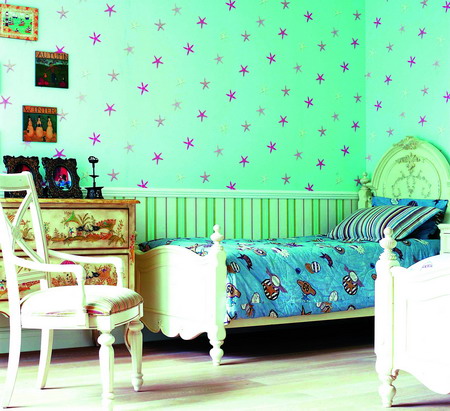 房間里漂亮的藍色是用兒童專用的純紙壁紙,用經(jīng)過國家認證的水劑添加膠粘貼,既照顧了滔滔的愛好,又避免了色彩漆重金屬含量高的危險。2層的墻群設計很精彩,讓整體在統(tǒng)一中有變化。