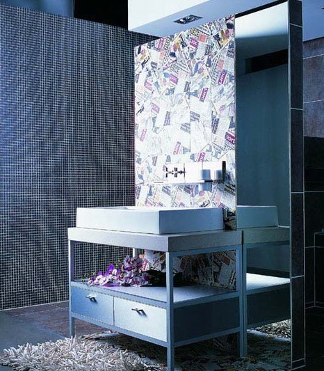 如果你的墻面底色較深就運(yùn)用博洛尼最大膽的POP花色瓷磚作為主題墻裝飾墻面吧。讓報(bào)紙堆砌出的亮麗色彩大面積裝飾,拼貼的效果會(huì)使浴室設(shè)計(jì)看起來更加大氣,配上熠熠生輝拉絲鋁浴室家具和亮面鏡子絕對(duì)拉風(fēng)。張揚(yáng)的創(chuàng)意是時(shí)尚年輕人不二的選擇。