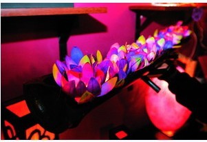 今年,紙燈造型更加多種多樣了,除了傳統(tǒng)方形、柱形、圓形,還有橄欖形、花形、貝殼形等。由于材料是紙,所以這類圖案很豐富,有用毛筆勾勒出的梅、蘭、竹、菊,傳統(tǒng)意味十足;有的燈利用了紙漿原有的抽象花紋,顯得很另類;還有種樹葉燈是樺樹葉和樺樹皮制成,薄得可見樹葉紋理;還有的直接把干花壓入紙中,當(dāng)開燈時,干花在紙上若隱若現(xiàn)的,意境很美。