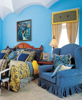 B:藍色墻面與藍色布藝和諧搭配