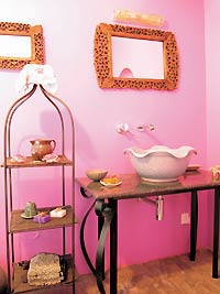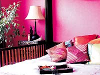 一說到泰國,頭腦中就閃出一個字“艷”。雖然家具是深栗色,但是泰式的裝飾品多是色澤極為艷麗的。金色、翠綠的紗幔,金色珠簾、真絲靠墊、粉紅的荷花蠟燭……有了這些,深色的家具反而更添香艷意味。
