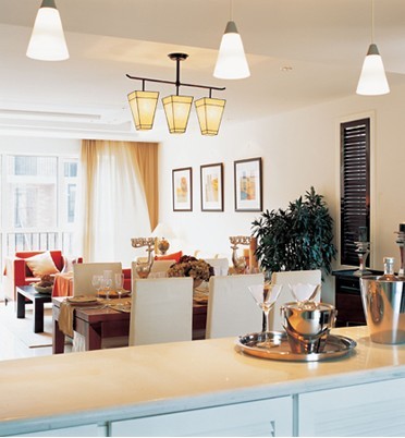不過(guò),廚房吧臺(tái)與客廳里的吧臺(tái)有很大的不同??蛷d是居室的重點(diǎn)區(qū)域,一般都裝飾得非常講究。而廚房吧臺(tái)則要與廚房、餐廳的潔凈、實(shí)用的環(huán)境相適應(yīng),造型應(yīng)簡(jiǎn)潔明快。但它畢竟又具有一定的裝飾性,所以應(yīng)富于生氣,要盡量避免呆板生硬的設(shè)計(jì)。