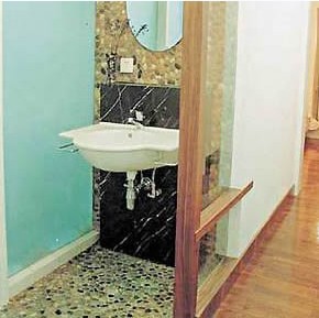 許多人都以為鵝卵石只能鋪在地上,設(shè)計(jì)師卻一改思路,不僅僅在浴室的地上鋪滿(mǎn)了深淺不一的鵝卵石,連墻壁也鋪滿(mǎn)。為了與鵝卵石的顏色相配,水盆選擇了簡(jiǎn)單的黑白色。除了圓圓的梳妝鏡旁擺放一瓶小干花外,沒(méi)有花巧的裝飾。這種設(shè)計(jì)讓小小浴室的裝修風(fēng)格保持一致,人在里面,就好像置身于郊外,充滿(mǎn)了休閑自在的氣氛。也許設(shè)計(jì)師對(duì)這個(gè)設(shè)計(jì)很滿(mǎn)意,所以浴室采用透明的玻璃門(mén),讓每一個(gè)客人都欣賞到這一有趣而大膽的設(shè)計(jì)。