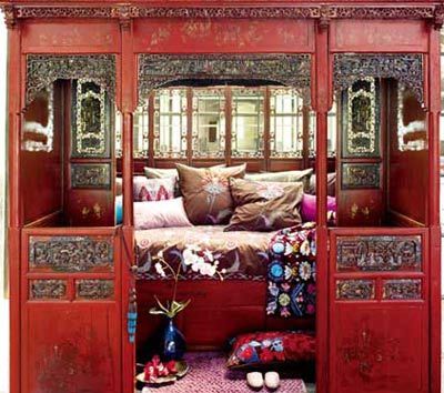 比如,中國(guó)的古老的大床,就是一種非??茖W(xué)的產(chǎn)品。這種床統(tǒng)稱架子床??煞譃椤杆闹病?,「六柱床」。其它變體形式較多,如月洞門(mén)罩架子床等。它三面有40公分高的圍欄,床口兩邊還有40公分寬的圍欄,只留1.2米左右門(mén)洞上落床。