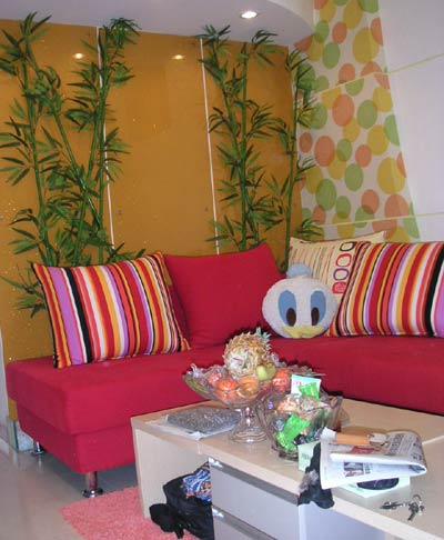 房子是女主人自己設(shè)計(jì),朋友幫忙裝修了,總造價(jià)是5萬元,裝成這樣的效果,絕對(duì)是超值。我的家是標(biāo)準(zhǔn)的單室廳,由于房間凈高有四米八,所以廚房及衛(wèi)生間上隔出了一間臥室,一進(jìn)門就可以看見客廳及衛(wèi)生間的墻體,所以種上了竹子增加一抹綠意同時(shí)也擋住了廁所的墻,橙色夾金絲的烤漆玻璃為客廳增加了一些暖意,意思沙發(fā)選用大紅色,也是增加了一種活潑的氣氛 。