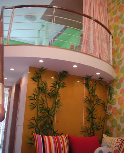 我的家是標(biāo)準(zhǔn)的單室廳,由于房間凈高有四米八,所以廚房及衛(wèi)生間上隔出了一間臥室,一進(jìn)門就可以看見樓上的臥室,所以采用一面落地簾把臥室和客廳分隔開,粉紅色的簾子和臥室地面的粉紅地毯相呼應(yīng),覺得很是柔和溫暖可愛,標(biāo)準(zhǔn)的紅粉女孩的閨房,墻紙也是特地選的彩色的增加一些卡通氣息,背后的翠綠色墻是女主人的最愛,為營(yíng)造臥室輕松的氛圍起到很好的作用。