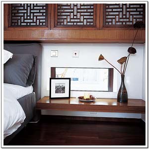床頭兩邊開(kāi)設(shè)的小窗戶是現(xiàn)代空間設(shè)計(jì)手法,并不具任何實(shí)用功能,因此這又是“借景”的傳統(tǒng)中式理念,獨(dú)具特色。