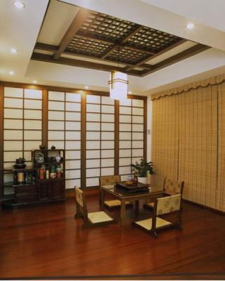 適用于和式風(fēng)格或是現(xiàn)代風(fēng)格的空間,一般采用簡潔大方、線條流暢、色彩淡雅的設(shè)計。茶室中多采用實木地板,再配以原木的矮桌和舒適的坐墊直接鋪設(shè)在地面上,桌上的紅木托盤中擺放著全套茶具。日式風(fēng)格的茶室經(jīng)常采用格子的圖案作為裝飾,比如在餐桌上鋪上潔凈素淡的格子布的桌巾,邊上放一盞簡簡單單、罩子同為格子花紋的白色紙燈,儼然是清新典雅的日式格調(diào)。