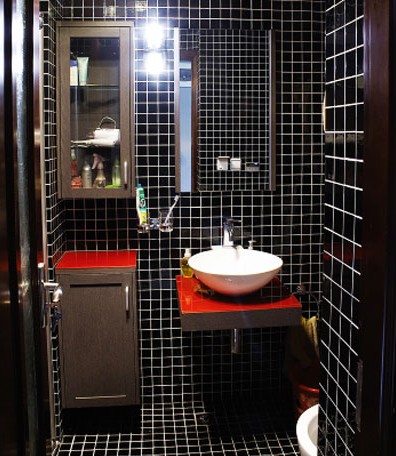 因此,設(shè)計裝修這一款衛(wèi)浴室的時候,正是緊緊圍繞這一主題展開的。除了合理布局浴缸、坐便器與盥洗盆,減少洗浴、洗衣和化妝洗臉的相互干擾等因素外,在色彩上也有一定的個性。黑色的亮光玻璃馬賽克,中間點綴一點紅色,這樣形成既深刻又強烈的視覺感。同時使用大片的吊頂鏡面來增加空間感,衛(wèi)浴中間是一個特別大的白色浴缸。白色浴缸與黑色墻面和地板,形成黑白分明的反差,再加上紅色馬賽克的點綴,增加了幾分魅惑和迷離。
