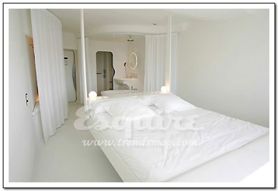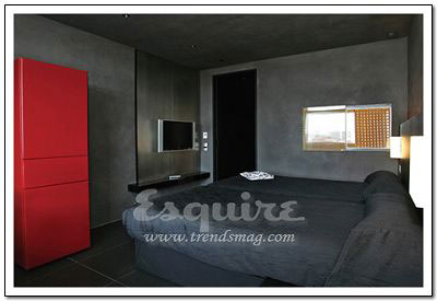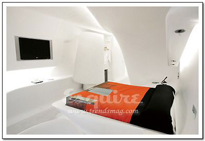 深處其中最大的感覺:流動。Zaha.Hadid在這套房間中以數(shù)字設(shè)計的新發(fā)展為基礎(chǔ),用流暢但不規(guī)則的墻壁線條,體現(xiàn)了空間流動性的特色,好像一個漂亮的模具。最不起眼的關(guān)鍵所在:電視機下的白色遙控器。它控制著屋內(nèi)所有內(nèi)嵌在墻壁內(nèi)的尖端數(shù)字設(shè)備,從激光燈到數(shù)字電視。最值得學(xué)習(xí)的搭配:橘黃色鑲黑的現(xiàn)代主義印花床單。