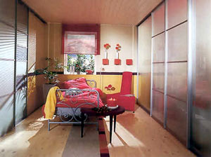 臥室里沿用了一些客廳的色彩和收納方法,留出了較大的臥室空間,避免了擁擠的感覺,便于營造靜謐的氣氛。高達天花板的書架和窗下設(shè)置的矮柜讓主人的收藏得到充分的收納和展示。床頭處安排了一面帶有隔板的背景墻,讓臥室和客廳的氣質(zhì)按照主人的喜好形成絕對的統(tǒng)一。床對面設(shè)有高達天花板的衣柜,可以把衣物和床上用品全部收納進去,在衣柜靠窗的一側(cè)還有一個大型的書架,用來擺放書籍和CD,生活里的精神享受得到了極大的重視。