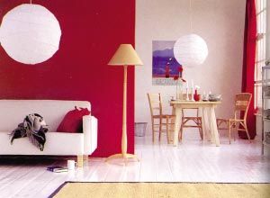 比如,一面白色的墻壁,可以作為以紅褐色與藍(lán)色為主色的現(xiàn)代繪畫的背景,相鄰的墻,飾以濃重的中國(guó)紅,與房間內(nèi)的藍(lán)色沙發(fā)形成鮮明的對(duì)比。一盞帶有土色燈罩的大燈在紅色的墻壁上勾勒出圓錐形的色塊。