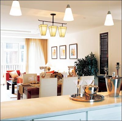 假如具備條件,單獨用一個空間做餐廳是最理想的,不但宴請朋友時比較方便,在布置上也靈活得多。對于住房面積不大的居室,也可以將餐廳設在廚房、過廳或者客廳。為了節(jié)省空間可考慮在廚房或過廳做折疊式餐桌。在沒有客人的情況下,主人不但可以從容就餐,還使空間顯得更加寬敞,合理利用空間。