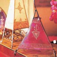 溫情臥室 皮革臺(tái)燈 用敲打的方式將洋鐵或其他金屬制成臺(tái)燈的支架,然后繃上用天然植物顏料染色處理過(guò)的牛皮等皮革制作的彩色手繪燈罩,放在臥室里就將夢(mèng)幻般的摩洛哥氛圍,以幻想般的手法表現(xiàn)出來(lái),令空間布滿異國(guó)情調(diào)。