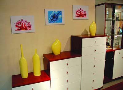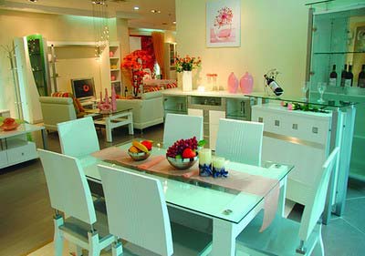 餐具配飾的選擇在白色家具的襯托下,粉紫色是非常迷人的色彩,能給人浪漫、溫馨的感覺(jué),用來(lái)營(yíng)造餐廳氣氛非常合適。餐桌上的配飾和餐具可以選擇比白色、粉紫色更明艷一些的玫紅色,以便更有對(duì)比層次。餐柜旁的鮮花架,增添了餐廳的浪漫柔和氣氛。