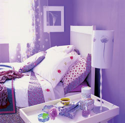 臥室里用了淡紫色的色調(diào),強(qiáng)化了浪漫的情致。臥室和客廳的家具用了統(tǒng)一的造型和色調(diào):白色的直線條的床,簡(jiǎn)單的白色床頭柜,還有纖細(xì)優(yōu)雅的臺(tái)燈。臥室的必備家具搭配有粉色和紅色花朵的軟性飾品:窗簾和靠枕、被罩。一間適合年輕夫婦的浪漫臥室就這樣布置出來(lái)了。