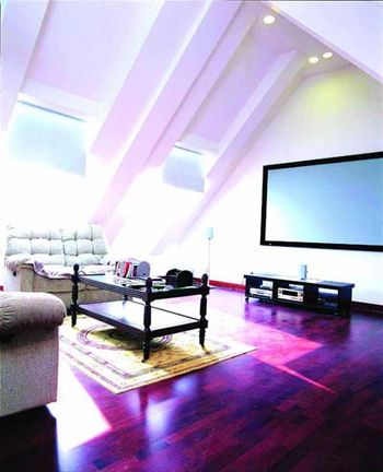 如今,在客廳里為自己預(yù)備一套“家庭影院”已經(jīng)并不稀奇了。利用閣樓空間,為自己和家人打造一個“高高在上”的“私人電影院”才叫時尚。一面墻的寬大屏幕,幾把舒適柔軟的沙發(fā),一滿桌的零食冷飲。當(dāng)窗簾放下,燈光熄滅,一家人滿懷期待地注視著銀幕,此時的觀賞感受是任何高檔電影院都提供不了的。為了增加些家庭的樂趣,你還可以在電影“放映”前自己動手畫一幅“宣傳海報”貼在餐廳的墻上,或是畫幾張“電影票”送給家人們。
