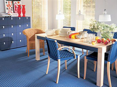 餐廳看起來很整潔,采用了藍(lán)色和白色為主,看起來很舒服。墻壁上做了藍(lán)色的柜子很實用,它就像是個百寶箱可以使餐廳變得很干凈。為了擺脫單調(diào)感,擺放了色彩較強(qiáng)的紅色裝飾品。白色的吊燈突顯了餐廳的別致感,色彩整體搭配得非常漂亮。