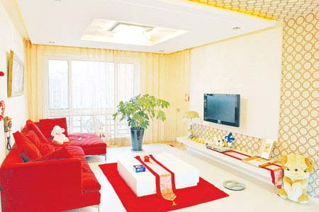 創(chuàng)意4:米黃色墻面緩解視覺疲勞。在紅色為主色調(diào)的屋子里,為了不使這種強(qiáng)烈的色調(diào)過于擴(kuò)張,造成視覺疲勞,可以在墻面選用米黃色,使得熱情的格調(diào)中增加一些優(yōu)雅與平易。另外質(zhì)地柔軟飄逸、顏色柔和的窗簾和綠色植物以及淺色的木地板都起到了中和作用。