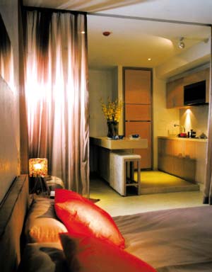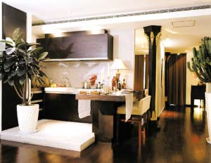 2.廚房就在客廳旁,用一個頗有個性和意境的屏風分隔,既節(jié)省了空間,又調(diào)動出整個房子的味道。