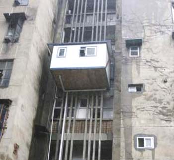 被稱為“史上最牛的廚房”懸身于青山116街坊22棟7單元5樓外墻上。27日下午2時許,記者在樓下看到,該廚房依靠兩根斜拉的三角鋼焊接在五樓頂窗桿上,廚房是用活動板和鐵皮做的,長約3米,寬約2米,高約2米。閣樓外墻上開有兩扇小窗,其中一扇有抽油煙機(jī)排氣管。該樓有7層,僅5樓外墻建了廚房。遠(yuǎn)遠(yuǎn)看去,在平整的樓房外墻映襯下,顯得格外突出。