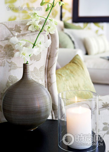 布藝沙發(fā)也同樣遵循了花色與純色混搭的原則,奶白色的雙人沙發(fā)用淺灰綠的靠包來點綴,分坐兩旁的單人沙發(fā)則使用枝葉與花朵的暗紋來處理,旁邊配上深色的小茶幾,精致的圓肚細頸花瓶里悄悄探出一枝素雅的白色蝴蝶蘭,跟玻璃罩內點燃的白色蠟燭相映成趣。