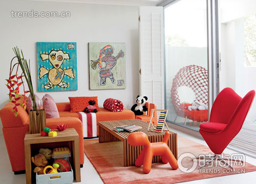 紅色跟橘色作為主調并不是很容易把握的,因為大面積此類顏色的使用容易使人感到煩躁,而這間客廳的搭配卻恰到好處。墻壁摒棄了花色的壁紙,保留純白的底色,只掛了兩幅充滿稚拙童趣的畫作,并以簡潔明快的天藍色打破視野中紅色占據(jù)的僵局。