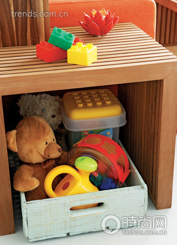 紅色單人轉椅跟外面的紅色圓頂鏤空沙發(fā)相配,自然而親切。橘色的拐角沙發(fā)線條干凈利索,上面擺放著玩具熊和各色靠包,玩具熊貓坐著的兩把小椅子和茶幾一側的小木馬,無一不透露著孩童的可愛。條紋茶幾和小柜子都選取原木材質,不論是茶幾上的珠算、小柜子下面收納的各式玩具,還是木質方花瓶中垂落下的紅綠相間的枝葉,全都非常貼合房間諧趣歡快的主題風格。
