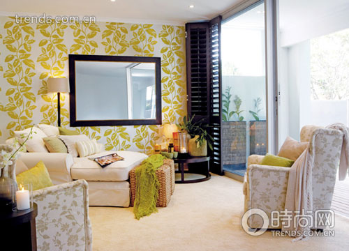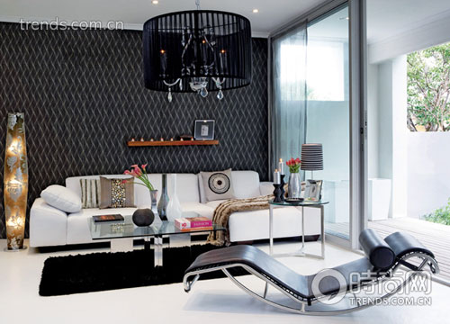 墻壁大面積使用黑底白紋的圖案,給地板留出足夠簡潔的空間。沙發(fā)上方做出的原木架將發(fā)散的目光重新聚集,照片擺在一側,圓扁的小蠟燭悄悄亮起,讓氣氛一下活躍起來。水晶吊燈線條優(yōu)美,外面籠罩了一層黑色豎紋裝飾,與沙發(fā)前純黑的地毯遙遙相望,而躺椅完美的弧度在提供給主人充足的休息之余,也配合著前兩者成為屋內最為深暗的色彩之一。橫排的白色沙發(fā)顯露出十足的貴族氣息,高高豎在一側的地燈也相應地做出漂亮的大花圖案,亮燈時花朵若隱若現(xiàn),朦朧之美呼之欲出。