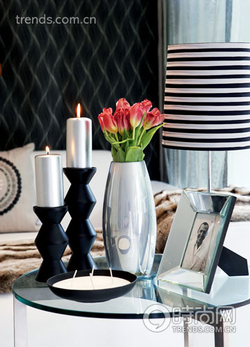 搭配黑白兩色,最佳伴侶無外乎金屬與玻璃材質。茶幾是玻璃的,燭臺是金屬的,雖然摩登,卻不免冰冷。于是點燃蠟燭,紅色郁金香簇擁而上,頓時讓人感到鮮活蓬勃的生機,主人的照片靜靜擺放在一旁,也讓房間多了一絲溫暖。
