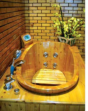 如果真的追求古人沐浴的感覺,這款圓木桶應(yīng)該是最好的選擇,跟在電視上看到的模樣幾乎一樣,只是感覺用材更優(yōu)良,不必?fù)?dān)心發(fā)霉,而且還加了個(gè)小梯子,更顯人性化。要不這么高的木桶,還真該考慮要怎么走進(jìn)去。在木桶里灑上些花瓣,就和想象中的古人沐浴更加接近了;如果覺得那還不夠愜意,盡可以倒些牛奶、啤酒進(jìn)去,古今結(jié)合,定能洗出一身好皮膚。