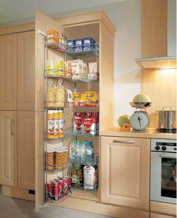 櫥柜的“全”,指功能全,操作、儲物、電器使用、垃圾處理等功能一應俱全。操作臺應用的水槽常為雙水槽,清潔和分理互不影響。儲物空間博大精深,既有普通的抽屜又有放置果蔬的儲物籃,還有各種各樣的儲物層架。電器往往都采用嵌入式,外觀看不出名堂的柜門,拉開后可能是微波爐,也可能是消毒碗柜。