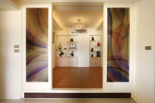 一進(jìn)門,長型的玄關(guān)處透過地面的高低差距區(qū)隔玄關(guān)與室內(nèi)空間,在落差處并以燈光輔助,增加安全性。水晶感應(yīng)的玄關(guān)燈讓整體空間初始即呈現(xiàn)出豪宅的大器磅礡,端景處做工細(xì)緻的玻璃拼貼以魚的圖像象征“魚躍龍門”的意象。
