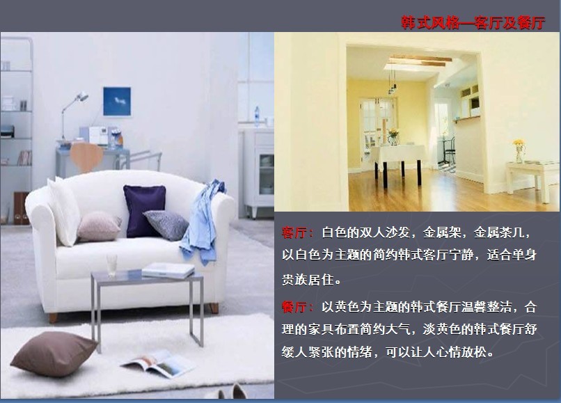 概要: 韓式裝修風(fēng)格大盤點(diǎn)韓式裝修風(fēng)格大盤點(diǎn) 韓式田園風(fēng)格可能是大多數(shù)年輕女孩比較喜歡的噢,它的重要元素是色調(diào)以柔和浪漫的粉色為主,浪漫的蕾絲、綠色植物、經(jīng)典的白色家具、隨處可見的卡通娃娃、毛絨地毯等裝飾?! 】蛷d:白色的雙人沙發(fā),金屬架,金屬茶幾,以白色為主題的簡約韓式客廳寧靜,適合單身貴族居住。