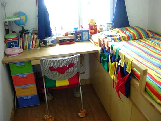 兒童房寬2米2,長2米4。只能放一張書桌一張床。所以做了一張高床,床下空間可以放玩具和女兒自己的衣物。女兒和來玩的小朋友都很喜歡這張床。