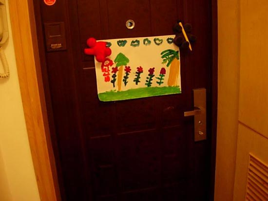 門后留言處。門向一側(cè)稍稍移了一點(diǎn),使的另一側(cè)可以容納一個(gè)大鞋柜。